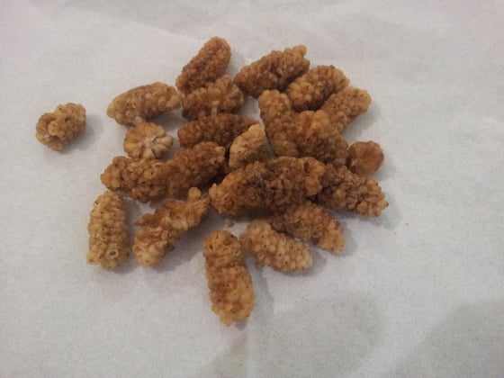 Kirtap hat getrocknete Maulbeeren gegessen - die weissen. Die roten wurden mir am 23.06.2015 frisch gereicht im Garten meiner damaligen Gastgeber - sie sind nach den
